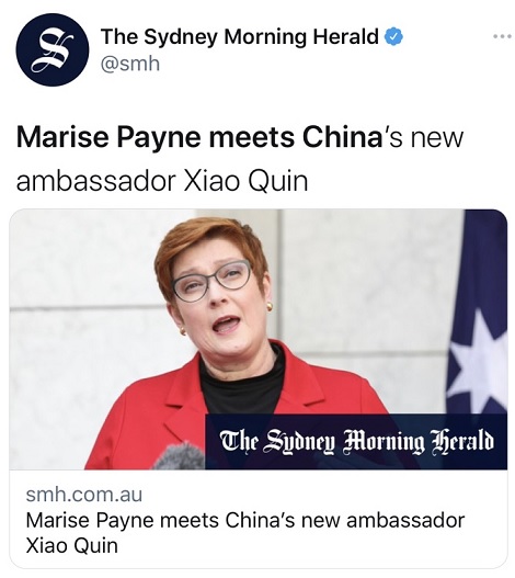 《悉尼先驱晨报》报道称,此番澳大利亚政府部长级官员会见新到任的中国驻澳大使,是两国之间几年来最高级别的对话接触,但双方未能解决任何悬而未决的分歧。