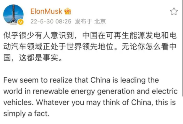 马斯克周一在微博上发文称:“似乎很少有人意识到,中国在可再生能源发电和电动汽车领域正处于世界领先地位。无论你怎么看中国,这都是事实。”