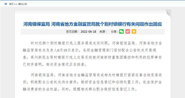 公告显示:针对近期个别村镇银行线上服务渠道关闭问题,河南银保监局、河南省地方金融监管局有关负责人6月18日表示,各级金融管理部门密切配合公安机关开展调查,禹州新民生等村镇银行线上交易系统被河南新财富集团操控和利用的犯罪事实已初步查明,相关资金情况正在排查。