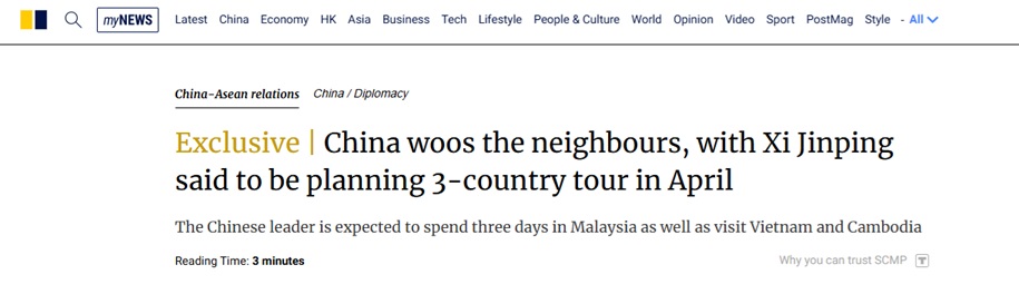 《南华早报》报道称,此次东南亚之行将是习近平今年首次出访,目前中国正努力加强与邻国的关系,以展现自己作为一个值得信赖和负责任的地区伙伴的地位。
