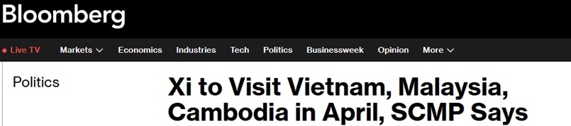 外交消息人士称,习近平可能于4月中旬启程,途经越南、马来西亚和柬埔寨。一位不愿透露姓名的消息人士称,中国领导人计划在马来西亚停留三天。