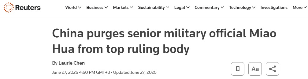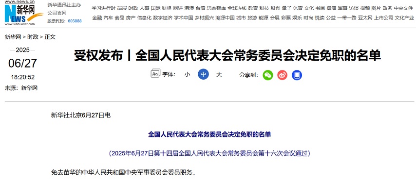 FX168财经报社(亚太)讯 英国路透社引用新华社周五(6月27日)声明报道称,中国人大已投票决定,免去高级将领苗华在中央军委的职务。中央军委是中国最高级别的军事指挥机构。