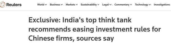 FX168财经报社(亚太)讯 英国路透社周五(7月18日)发布独家报道称,三位政府消息人士称,印度政府顶级智库提议放宽针对中国企业投资进行额外审查的规定,并称这些规定导致一些大型交易被推迟。