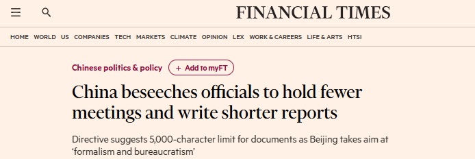 中国重大信号!英国金融时报:中国吁官员减少会议次数并缩短报告篇幅