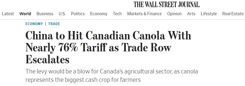 FX168财经报社(亚太)讯 美国《华尔街日报》周二报道称,在中国当局表示,打算对加拿大油菜籽征收约76%的关税后,中国与加拿大的贸易冲突升级,这部分产品占加拿大农作物销售额的四分之一。加拿大农民表示,此举将使他们无法进入中国这个世界第二大经济体。