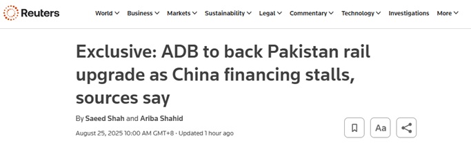 FX168财经报社(亚太)讯 英国路透社周一(8月25日)发布独家报道称,两位消息人士表示,亚洲开发银行(Asian Development Bank)将取代中国,为巴基斯坦部分老旧铁路系统的升级提供资金,此前,巴基斯坦长期未能获得北京方面的融资,这可能会给一项战略性采矿项目带来压力。