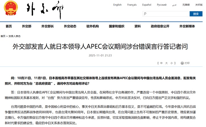 此外,根据中国外交部网站,外交部发言人就日本领导人APEC会议期间涉台错误言行答记者问。