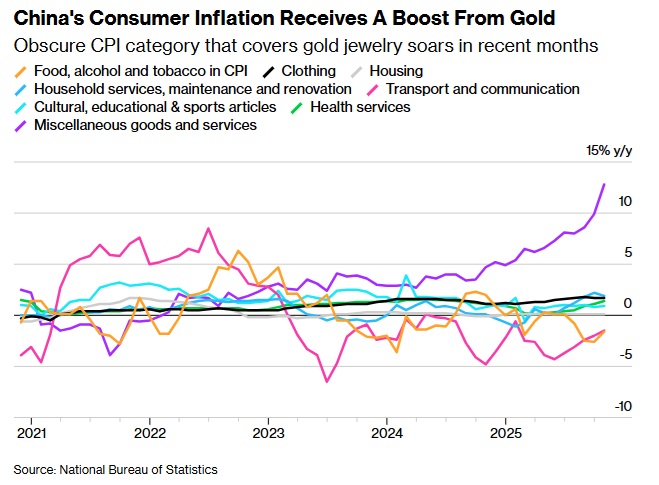花旗集团(Citigroup Inc.)指出,尽管黄金和铂金首饰在消费者物价篮子中的权重不足1%,但金价飙升对中国的影响却格外显著。据该行估算,黄金对核心CPI和核心商品通胀的贡献约为“零点几个百分点”。国家统计局数据显示,10月份这类首饰价格上涨了约50%。