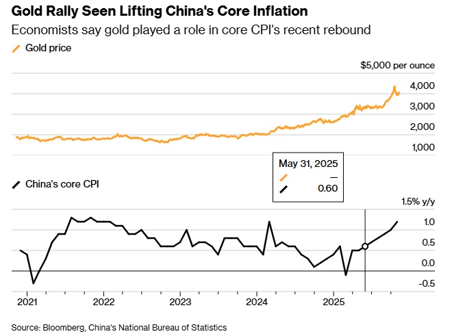 根据高盛集团(Goldman Sachs Group)和申万宏源集团(Shenwan Hongyuan Group)的估算,10月份黄金价格上涨对核心CPI(剔除食品和能源价格)约1.2%的涨幅贡献了近一半甚至更多。