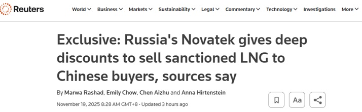 FX168财经报社(亚太)讯 英国路透社周三(11月19日)发布独家报道称,知情人士告诉路透社,自8月以来,俄罗斯液化天然气生产商诺瓦泰克(Novatek)已将其液化天然气货物的价格下调30%至40%,以吸引中国买家购买其北极液化天然气2号项目所生产、受制裁的天然气。