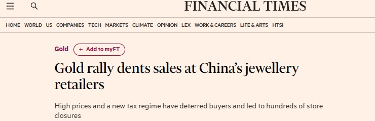 FX168财经报社(亚太)讯 英国《金融时报》周一(12月1日)报道称,在全球最大黄金消费市场之一的中国,高金价吓退买家,再加上退税下调,令珠宝零售商深受打击,已导致数百家门店关闭。