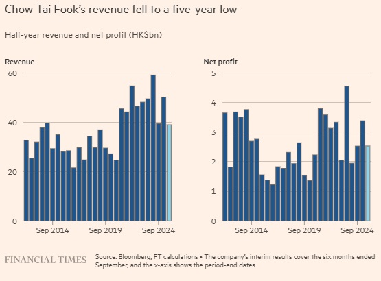 按销售额计为中国最大珠宝零售商的周大福今年已关闭约1,000家内地门店,门店数量减少15%。该公司上周二公布,截至9月底的上半财年净利润为25亿港元(3.2亿美元),与去年同期持平;在390亿港元营收下创下五年来最低水平。