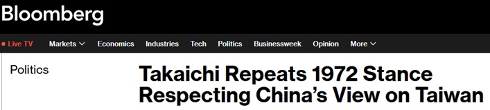 自高市早苗上月发表引发争议的言论以来,外相茂木敏充(Toshimitsu Motegi)也多次重申,日本的立场与1972年时并无变化。