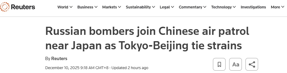 FX168财经报社(亚太)讯 英国路透社周三(12月10日)最新报道称,日本防卫省周二深夜表示,日本已紧急出动战机,对在日本周边进行联合巡航的俄中两国空军实施监视。在东京与北京关系紧张加剧之际,此举凸显地区局势升温。