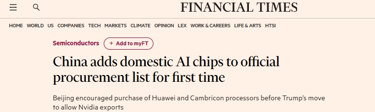 中国突传重磅!英国金融时报独家:中国首次将国产AI芯片纳入官方采购清单