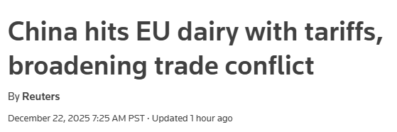 FX168财经报社(北美)讯 中国商务部周一(12月22日)表示,将对自欧盟进口的乳制品征收最高42.7%的临时关税,涉及牛奶、奶酪等多个品类。相关关税措施将于周二正式生效。