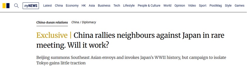《南华早报》称,这场在北京与东南亚高阶外交官举行的罕见会议,凸显中国正积极为其对日行动争取支持。然而,它同时也显示出中国外交能力的局限性,即便是在其具有相当影响力的邻近国家之中。