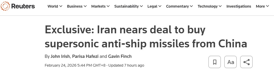 FX168财经报社(亚太)讯 英国路透社周二(2月24日)发布独家报道称,据六名了解谈判情况的人士透露,伊朗正接近与中国达成购买反舰巡航导弹的协议。与此同时,美国在可能对伊朗发动打击之前,正在伊朗海岸附近部署大规模海军力量。