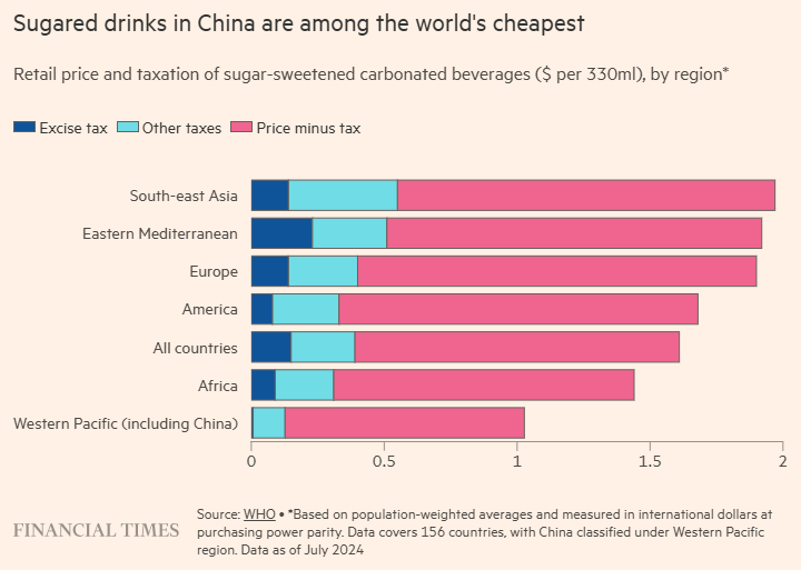 去年7月,世卫组织呼吁各国征收至少相当于零售价20%的糖税,目标是到2035年将含糖饮料价格提高50%。在中国,一瓶500毫升的可口可乐零售价通常约为3.5元(0.5美元),而东鹏特饮等本土品牌售价约为3元。