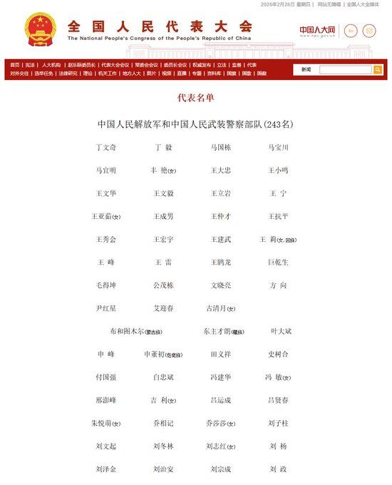 中国全国人大常委员会2月26日的公告称,截至目前,第十四届全国人民代表大会实有代表2878人。全国人大官网“代表名单”2月26日更新显示,解放军全国人大代表目前为243名。