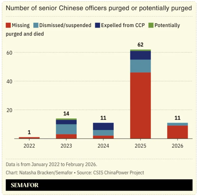 据近期一项研究估计,自2022年以来,约有100名高级将领被撤职或边缘化。
