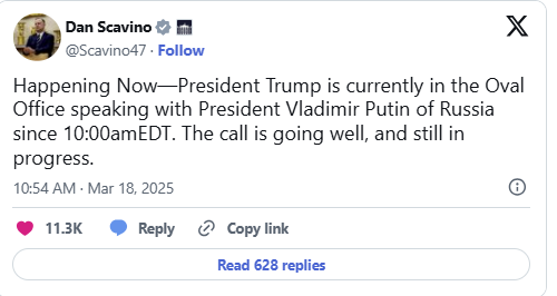 白宫副办公厅主任丹·斯卡维诺在社交媒体帖子中表示,通话“进展顺利”。