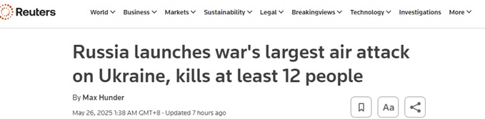 FX168财经报社(亚太)讯 英国路透社周一(5月26日)报道称,官员们称,俄罗斯军队周日夜间向乌克兰首都基辅等城市发射了367架无人机和导弹,这是迄今为止战争中最大规模的空袭,造成至少12人死亡,数十人受伤。