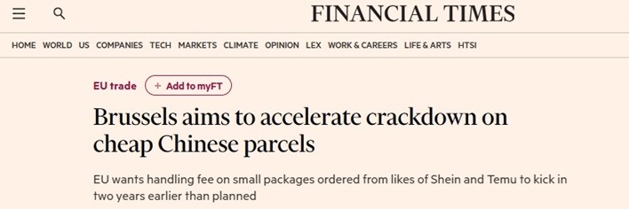 FX168财经报社(亚太)讯 英国《金融时报》周四(11月13日)报道称,布鲁塞尔呼吁自2026年初起在欧盟范围内对从Shein、Temu和阿里巴巴等平台网上订购的小包裹征收处理费,比原计划提前两年多,以打击每年数十亿件来自中国的廉价进口商品。