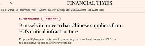 FX168财经报社(亚太)讯 英国《金融时报》周日(1月18日)发布独家报道称,根据官员们透露,布鲁塞尔将提议在欧盟关键基础设施中逐步淘汰中国制造的设备,禁止华为(Huawei)和中兴通讯(ZTE)等公司进入电信网络、太阳能系统和安检扫描设备等领域。