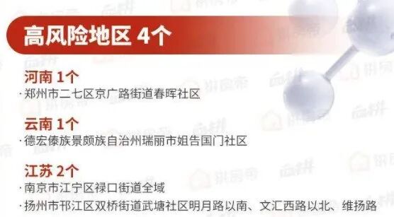 从7月底南京禄口机场多人感染开始,南京市累计报告本土确诊病例220例。中国已累计出现4个高风险地区,134个中风险地区。今天最新消息显示,澳门一家四口确诊,也与南京飞珠海的航班有关。