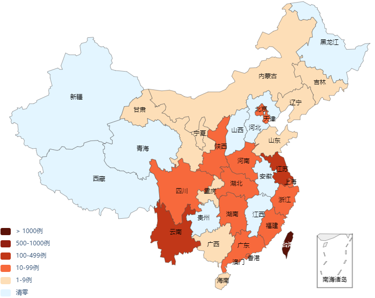 截止8月3日,新一轮疫情已传播至中国的15个省及直辖市,其中大部分与南京机场疫情有关。北京,上海和武汉在最近两天均发现确诊病例。
