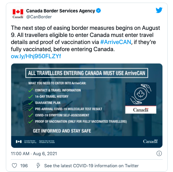 政府计划于 9 月 7 日向来自世界各地的已接种疫苗的旅客开放加拿大边境,但如果加拿大遭受严重的第四波疫情冲击,计划或会再作调整。前往加拿大的旅客还应注意,加美陆地边界的美国一侧至少在 8 月 21 日之前仍对非必要旅客关闭。
