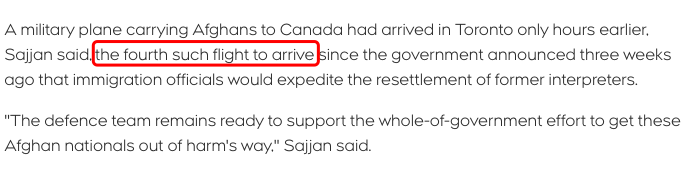 周三,再添一架载有阿富汗人前往加拿大的军用飞机抵达多伦多,这是自政府宣布加快重制阿富汗人以来的第四架此类飞机航班: