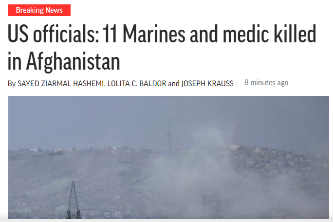 最新消息:美国国防部最新证实,喀布尔机场附近发生两起爆炸,造成12名美国军人死亡,另有15名美国军人受伤。