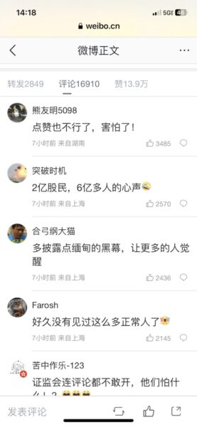 除了证监会发布外,上交所发布、证券时报、中国证券网等微博账号下用户也被禁止留言或留言不予显示。