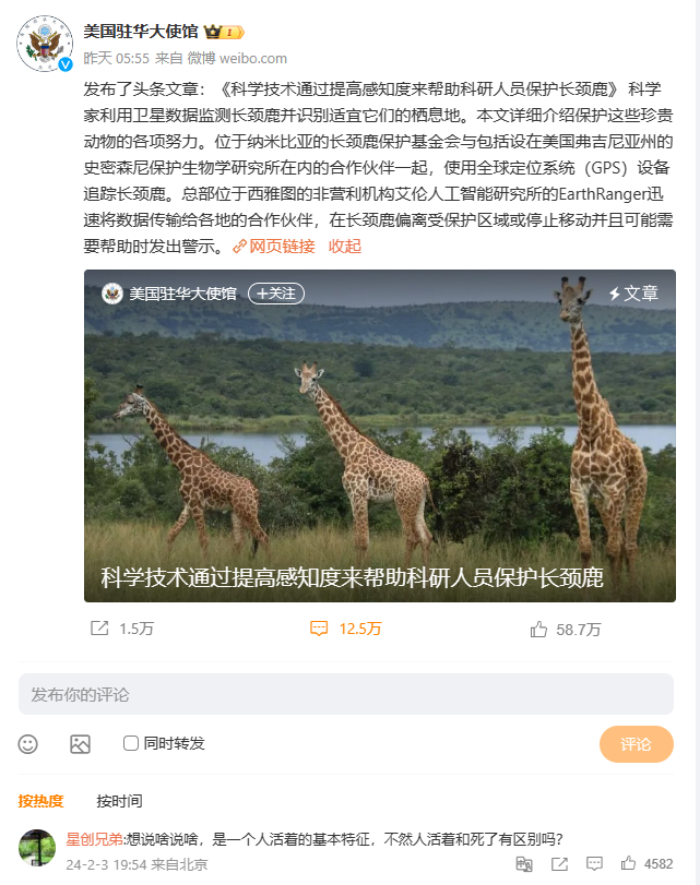 周五(2月2日),这篇文章出现在美国驻华大使馆的官方微博上,讨论了科学家利用卫星数据跟踪和监控长颈鹿的活动,并为这种长颈反刍动物确定合适的栖息地。但这条微博下面的评论区很快就变成了一个自由论坛,讨论中国经济状况以及最近股市和债券市场的动荡,数百名微博用户纷纷加入其中,有的开玩笑,有的抱怨,有的表示同情。一些人甚至恳求美国大使馆帮助拯救中国股市,或者允许他们投资美国股市或移民美国。