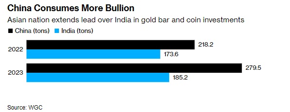 中国和印度通常会争夺全球最大黄金买家的头衔。但随着中国对珠宝、金条和金币的消费膨胀至创纪录水平,去年情况发生变化。中国的黄金珠宝需求增长10%,而印度则下降6%。与此同时,中国的金条和金币投资飙升28%。