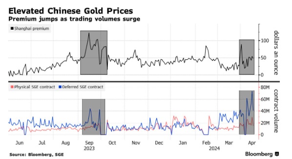 作为主要的黄金进口国,中国的黄金买家往往需要支付高于国际价格的价格。本月初,这一溢价跃升至每盎司89美元。过去一年的平均水平为35美元,而历史平均水平仅为7美元。