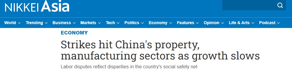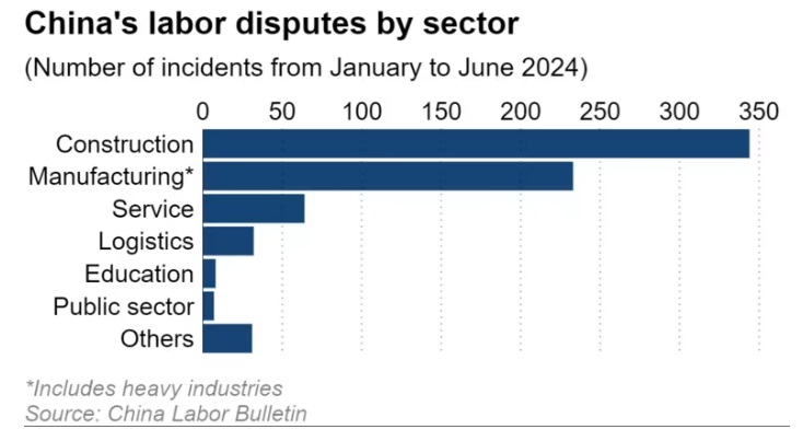 根据香港的工人权益倡导组织《中国劳工通讯》(CLB)的数据,2024年上半年,中国的劳工罢工事件同比增加3%,达到719起。涉及房地产和制造业的罢工事件增加了12%,占总数的80%。