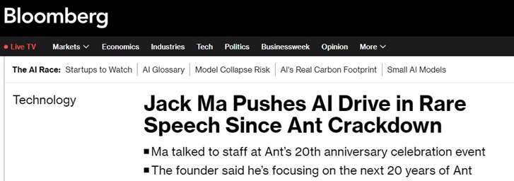 根据彭博社看到的一份演讲记录,这位蚂蚁集团及阿里巴巴(Alibaba Group Holding Ltd.)的联合创始人在周日露面,谈论了这家金融科技公司未来20年的发展以及人工智能带来的机遇。蚂蚁集团没有回复彭博社的置评请求。