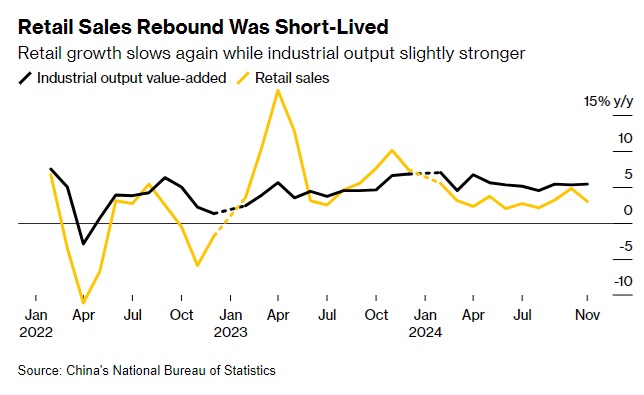 FX168财经报社(亚太)讯 美国彭博社周一(12月16日)最新报道称,中国11月份零售销售增长意外放缓,突显出北京方面进一步鼓励居民消费的紧迫性。