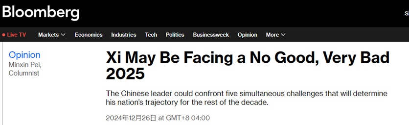 FX168财经报社(亚太)讯 彭博专栏作者、中国问题专家裴敏欣(Minxin Pei)周三(12月25日)撰文称,在2025年,中国国家主席习近平可能同时面临五大挑战,这些挑战将决定中国在本十年剩余时间的发展轨迹。