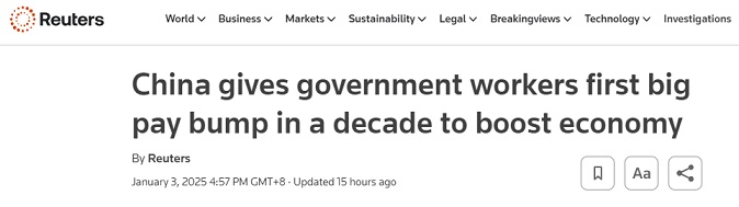 FX168财经报社(亚太)讯 英国路透社周五(1月3日)报道称,消息人士表示,中国各地数以百万计的政府工作人员本周出人意料地加薪。中国政府正寻求增加支出,以支持不断放缓的经济。