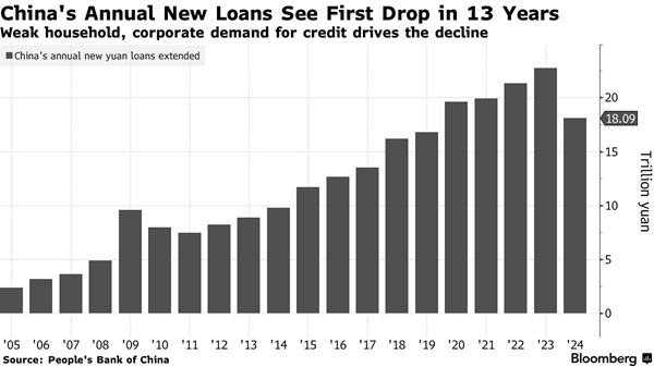 2024年新增贷款低于2023年的22.75万亿元人民币,是13年来首次出现年度下降。