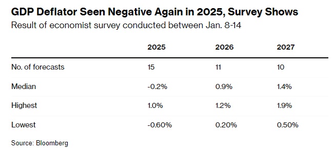 GDP平减指数在2024年10月至12月期间可能连续第七个季度处于负值,这一情况与1990年代末亚洲金融危机期间创下的纪录持平。
