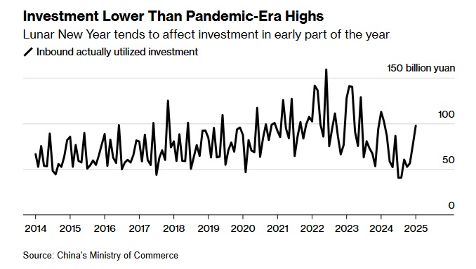 中国商务部周三发布的声明,2025年1月,中国实际使用外资金额975.9亿元人民币,较2024年同期下降13.4%,也低于2022年1月的1022亿元人民币,2023年1月的1276亿元人民币,为最近4年来最差开局。