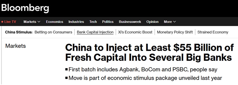 据彭博社去年报道,中国总计可能向其最大的几家银行注入高达人民币1万亿元的资本,资金主要来自发行新的特别主权债务。