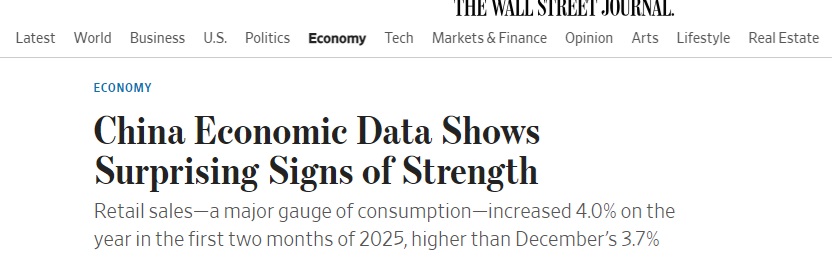 香港《南华早报》称,2025年前两个月消费增长了4%,激发人们对2025年中国经济强劲开局的希望。