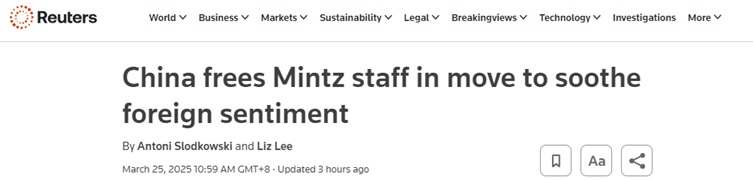 路透社称,在中美针锋相对的关税升级之际,中国释放美思明智员工的举动,表明北京方面渴望巩固与全球商界领袖的关系,以抵御美国总统特朗普引发的混乱。预计特朗普最早将于下个月对中国产品施加更多惩罚。