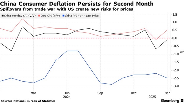 彭博社指出,虽然比往年提前的中国春节假期在2025年初推高了物价,但随着中美紧张关系升级为针锋相对的关税上调周期,通货紧缩风险也随之加剧。如果出口商将部分商品转向国内市场,或者其他面临美国关税上调的国家将产品转至中国,物价可能会面临进一步走低的压力。